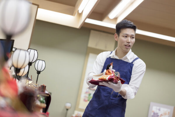 雛人形・五月人形のような伝統工芸品は、商品デザインの組み合わせが無限にあります。例えば人形の顔を作る人、胴体を作る人、屏風を作る人といった感じで、分業になっているのが特徴。私たち工芸品店は、それぞれのメーカーから各部品を取り寄せ、それらをアセンブルして1つの商品に仕上げているんですね。